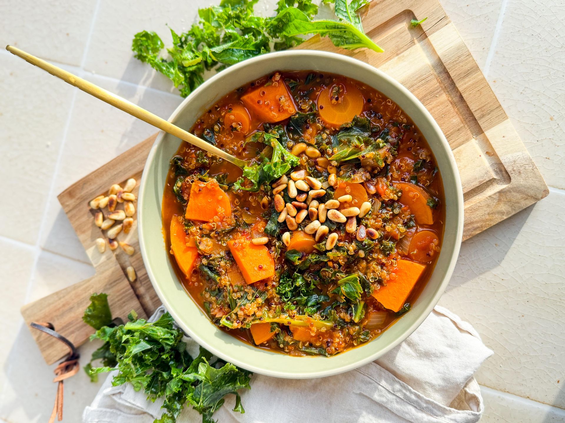 Dieser vegane Quinoa-Eintopf mit Grünkohl, Süßkartoffeln und gerösteten Pinienkernen von Nina von Foodykani ist nicht nur ein wahres Wohlfühlessen, sondern auch ein nährstoffreiches Gericht, das uns durch die kalte Jahreszeit begleitet.