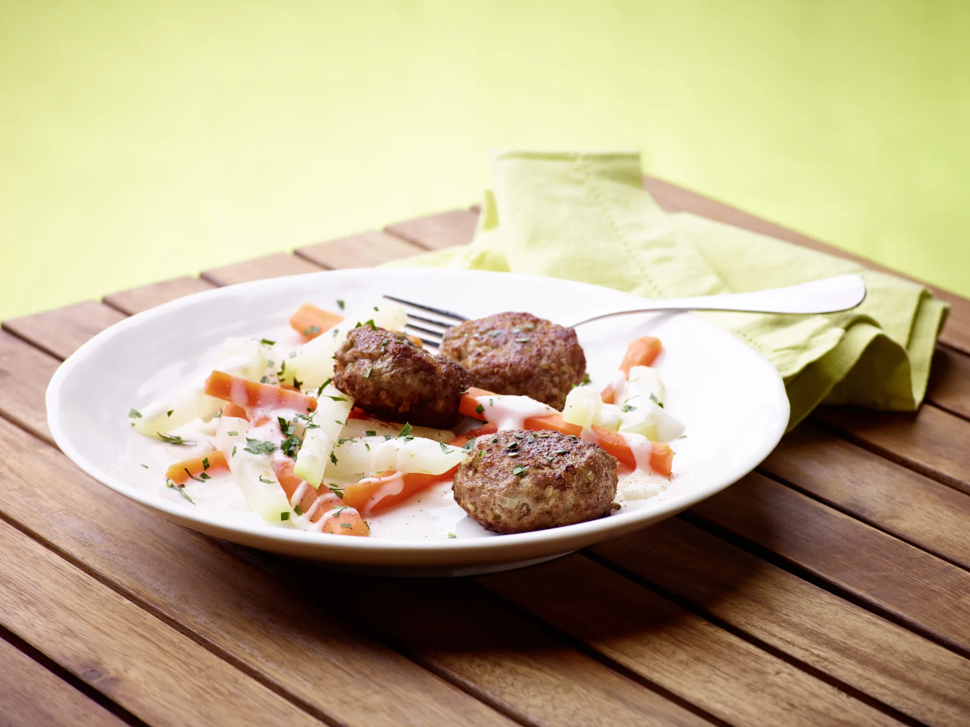 Minifrikadellen mit Kohlrabi-Möhren-Gemüse