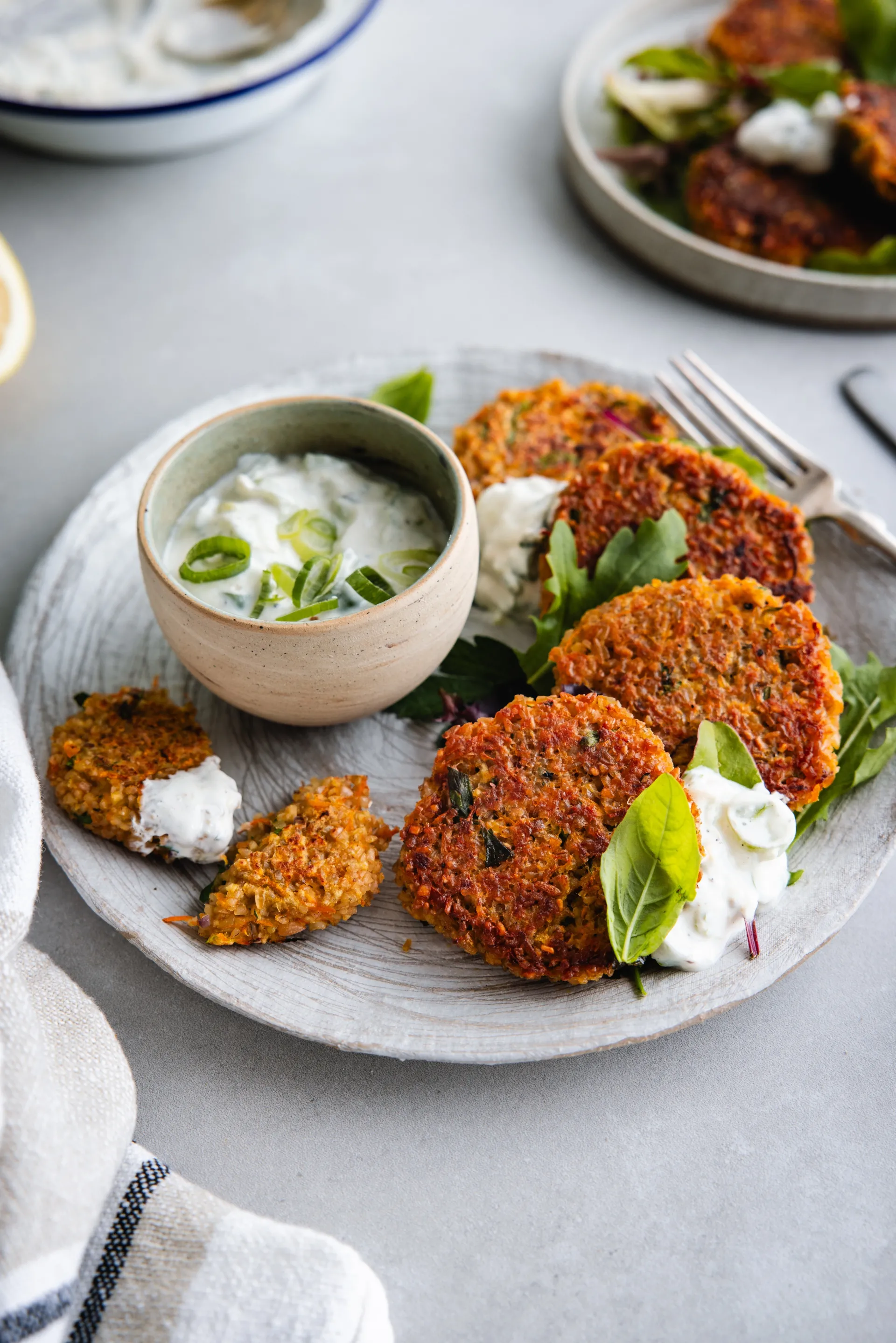 Die Bratlinge werden mit einer leichten Gurken-Raia serviert – einem indischen Joghurt-Dip, der durch orientalische Gewürze, Ingwer und Minze besonders erfrischend schmeckt. Kreiert wurde das Rezept für unsere Möhren-Grünkern-Bratlinge mit Gurken-Raita von Hey Foodsister.