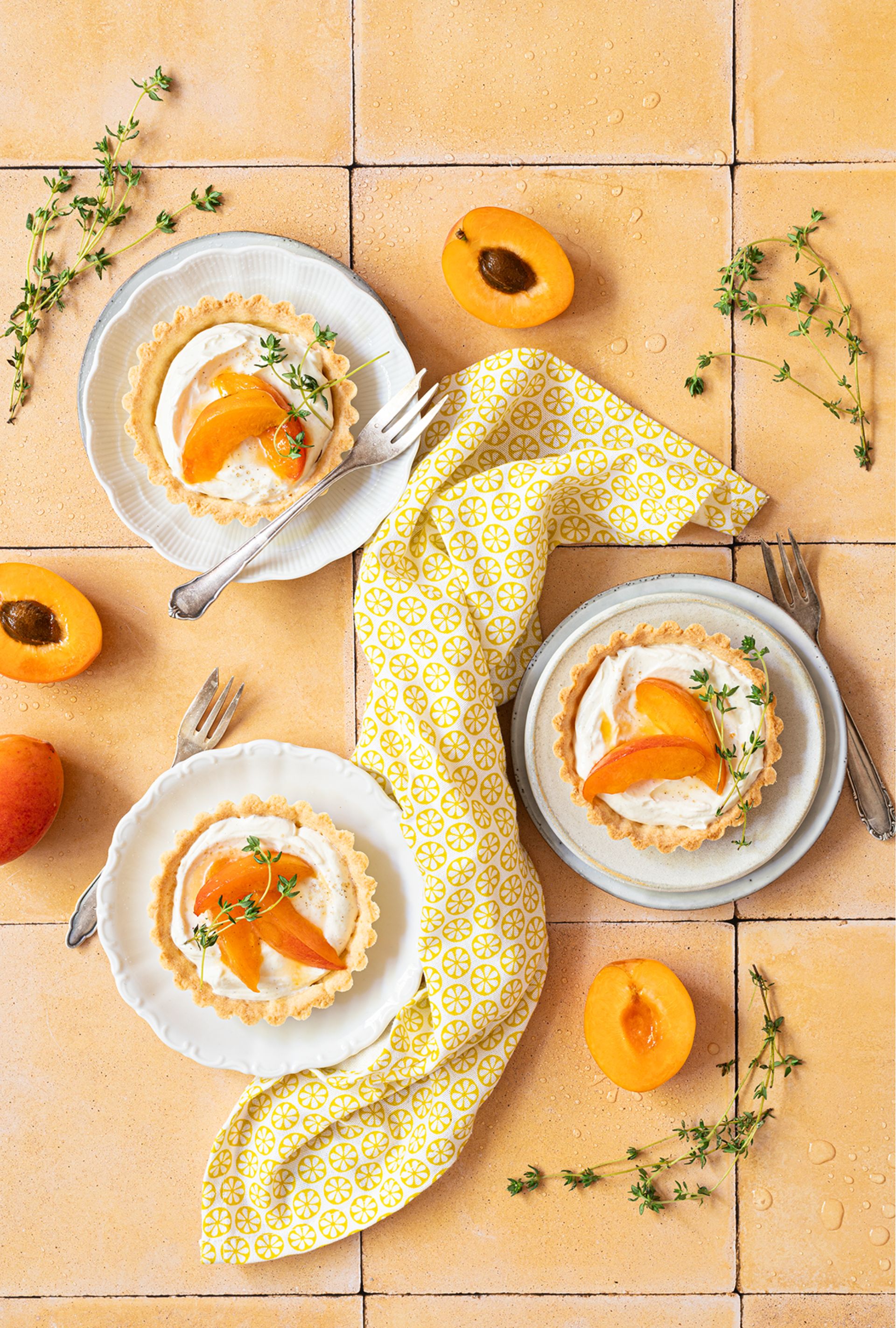 Joghurt, Mascarpone und Vanillezucker kurz aufschlagen. Zitronensaft unterrühren. In die Tartelettes geben und glatt streichen. 30 min. in den Kühlschrank stellen. Vor dem Servieren die Tartelettes mit Aprikosen und Thymian garnieren.