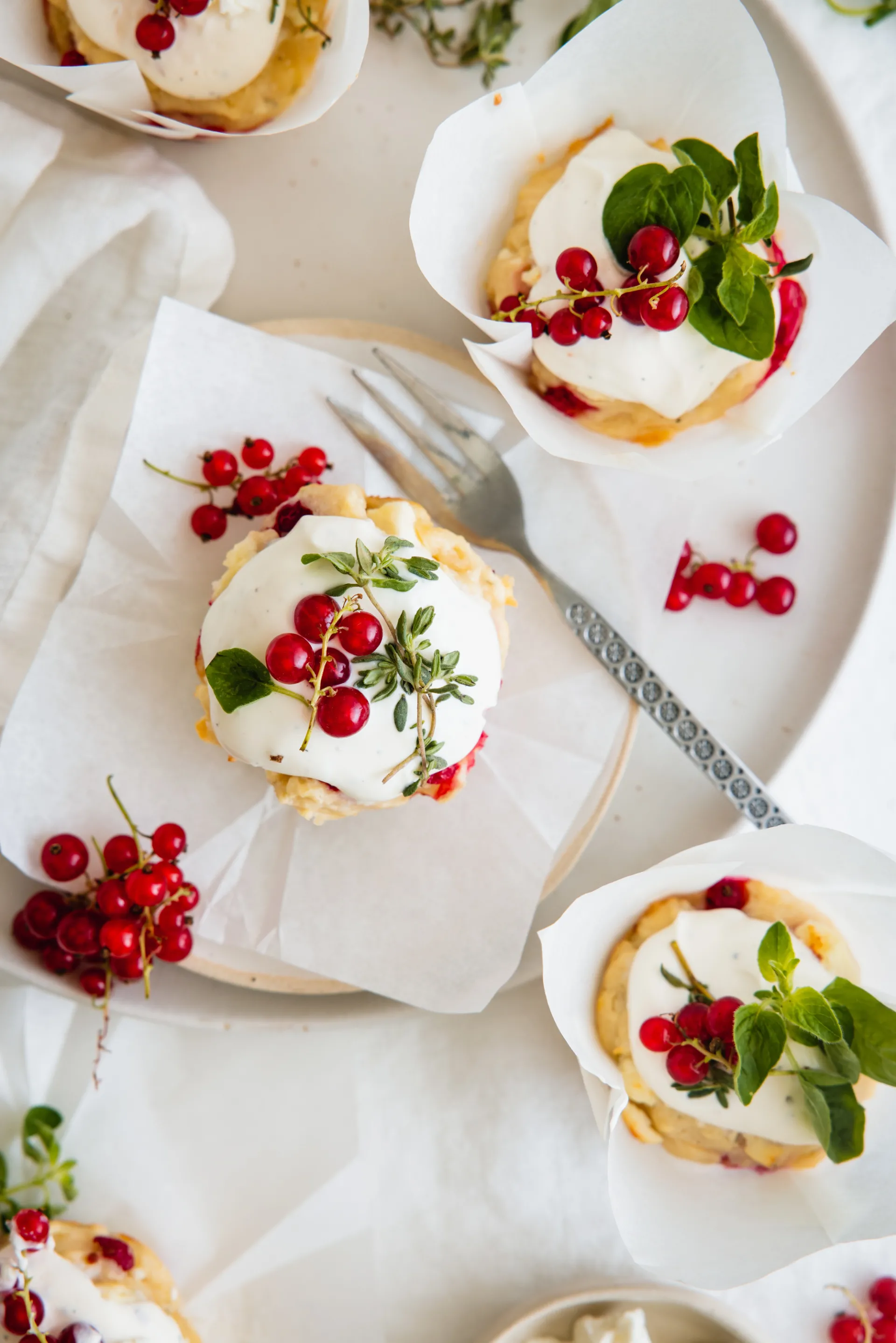 Für das Topping Saure Sahne und Frischkäse glattrühren. Mit Salz und Pfeffer würzen. Auf die ausgekühlten Muffins geben und mit Johannisbeeren sowie frischen Kräutern dekorieren.