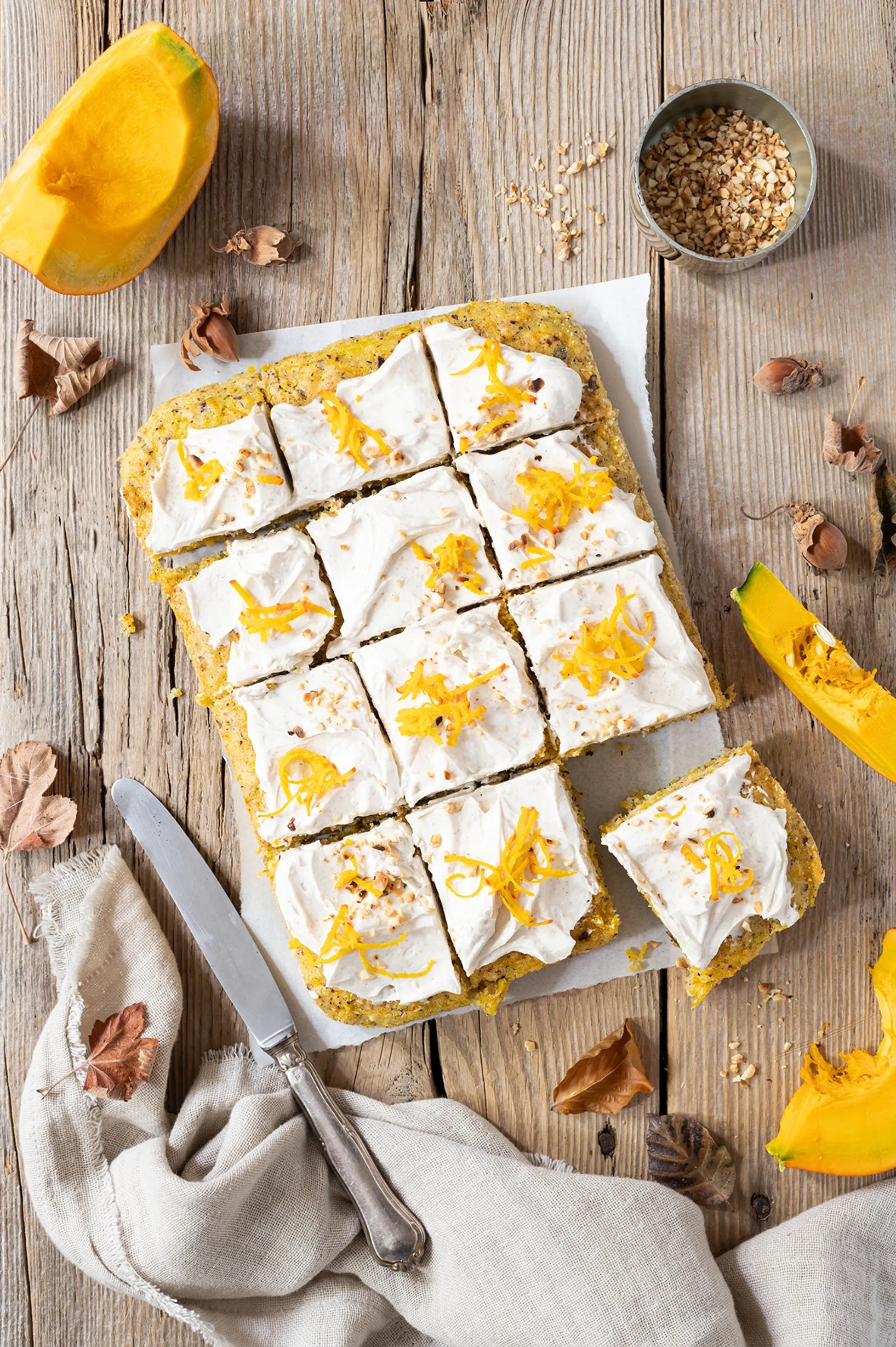 Die leckeren Kürbis-Nuss-Schnitten mit Zimtfrosting sind das ideale Gebäck für gemütliche Herbst-Nachmittage.