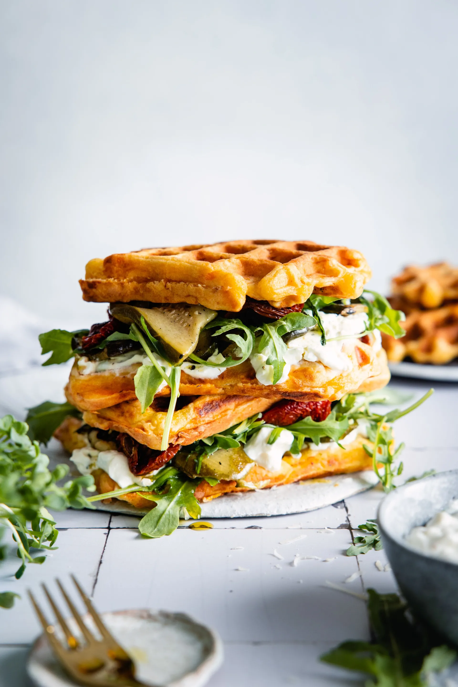 Aus je 2 EL Quarkcreme, einigen getrockneten Tomaten, gegrillten Zucchinistreifen und etwas Rucola 4 Waffel-Sandwiches bauen.