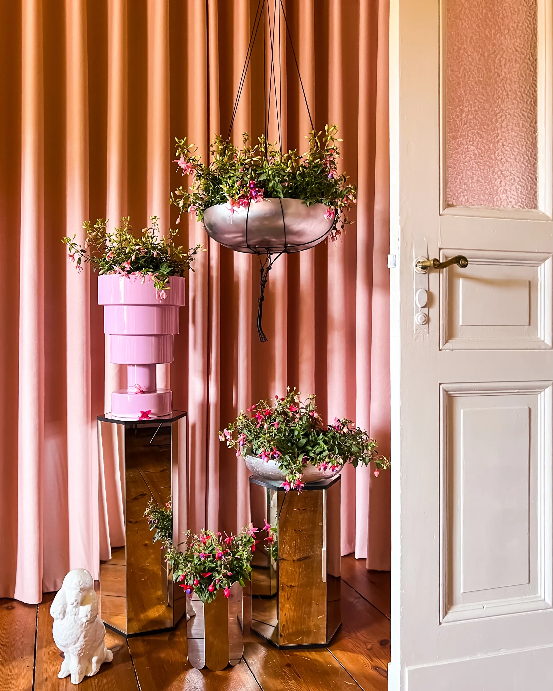 Wem es besonders pompös gefällt, der kann sich in diesem Schritt eine ganze Ecke im eigenen Heim mit weiteren Fuchsien in besonderen Gefäßen herrichten, so wie es auch Mike gemacht hat. Das Ergebnis finden wir bezaubernd!