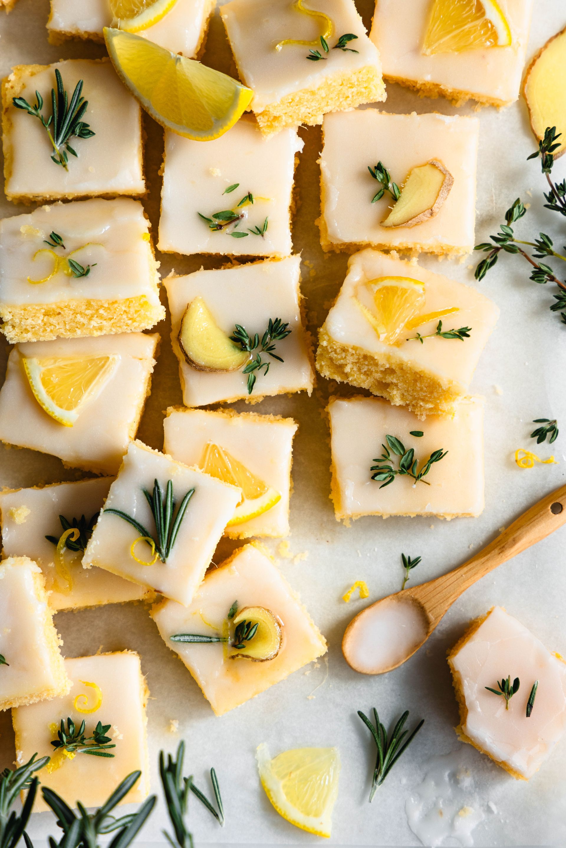 Für den Guss Ingwer fein reiben, mit Puderzucker und Zitronensaft glattrühren. Auf die Lemonies geben, in Stücke schneiden und mit frischem Thymian oder Rosmarin verzieren.