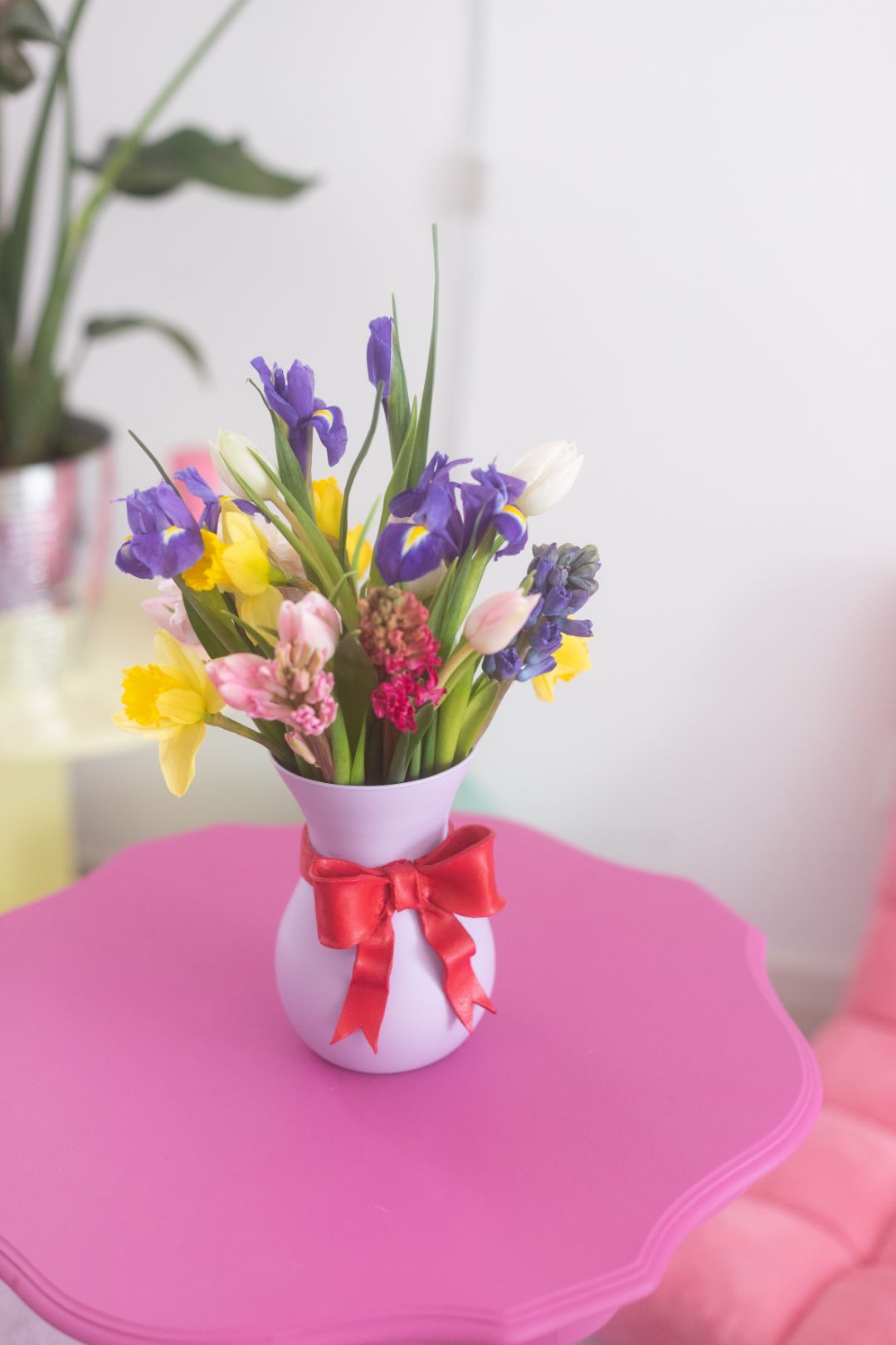 Zum Abschluss fehlt nur noch das i-Tüpfelchen: ein frischer, bunter Blumenstrauß für eure Pokalvase! Lisa hat sich dafür zum Beispiel Freesien, Tulpen, Iris und Narzissen ausgesucht – aber ihr könnt natürlich nehmen, was euch gefällt. Und schon habt ihr ein richtig schönes, selbstgemachtes Geschenk, mit dem ihr eurem Lieblingsmenschen am Valentinstag garantiert eine Freude macht!