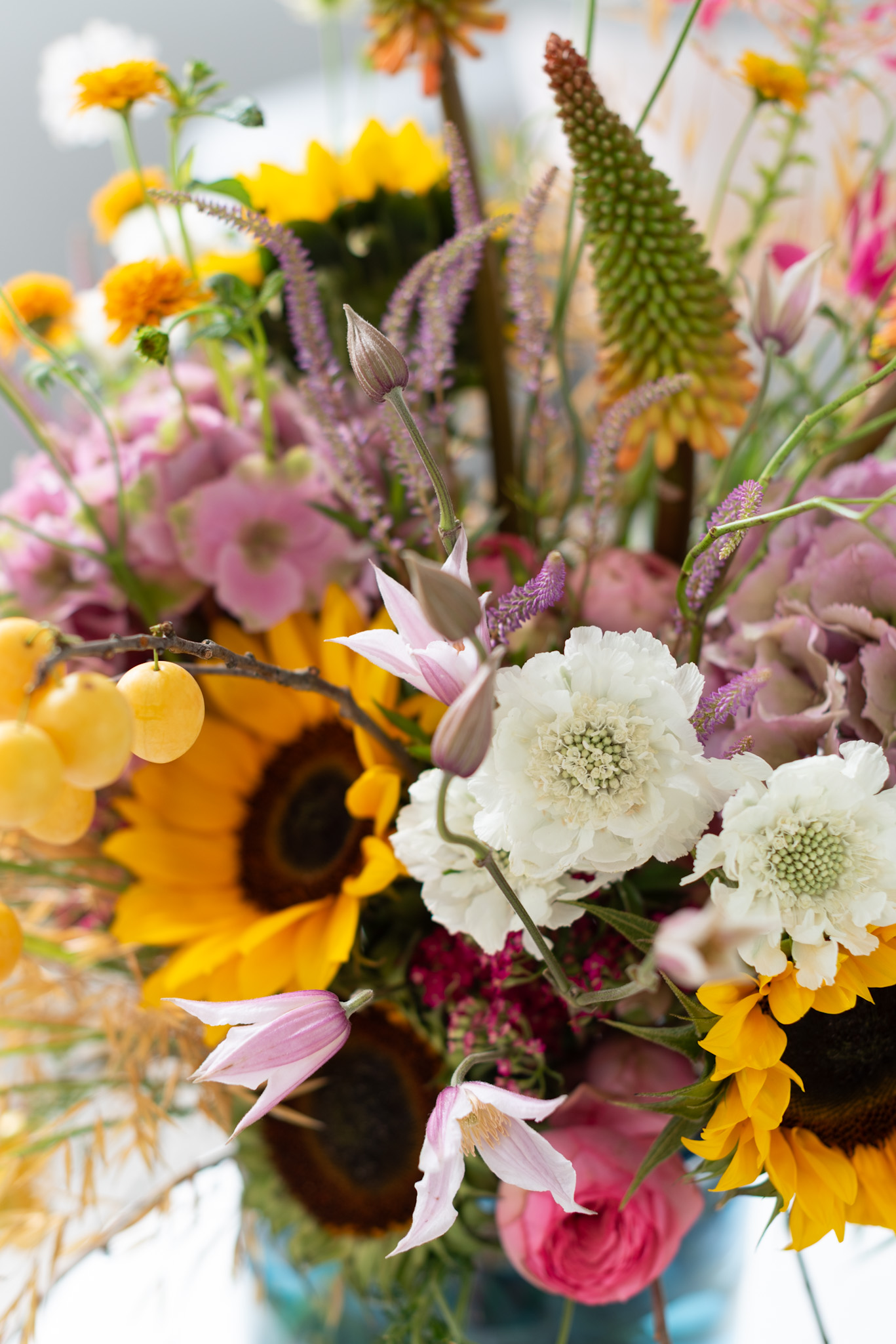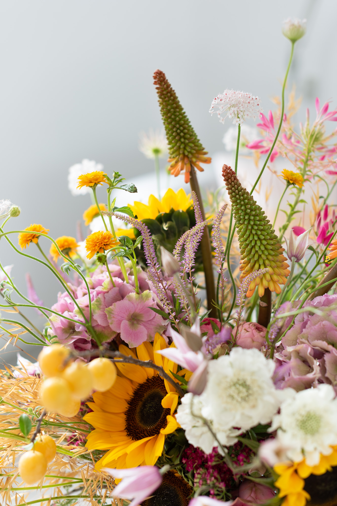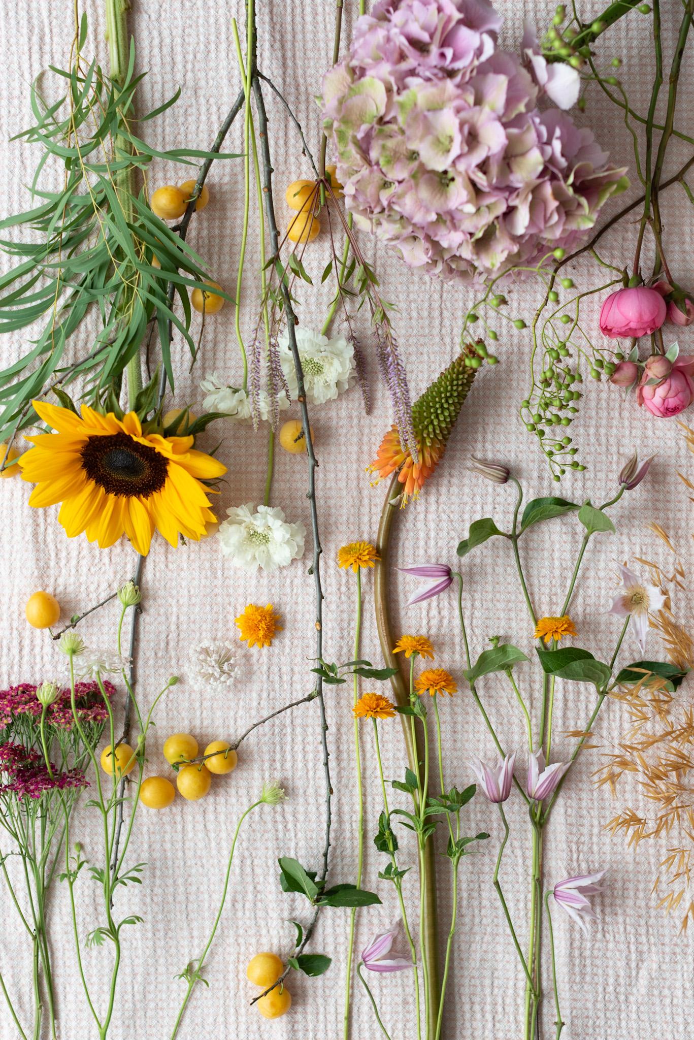 - Die Basis bilden: Hortensien und Sonnenblumen mittig anordnen – sie geben dem Ganzen Ruhe und Halt.