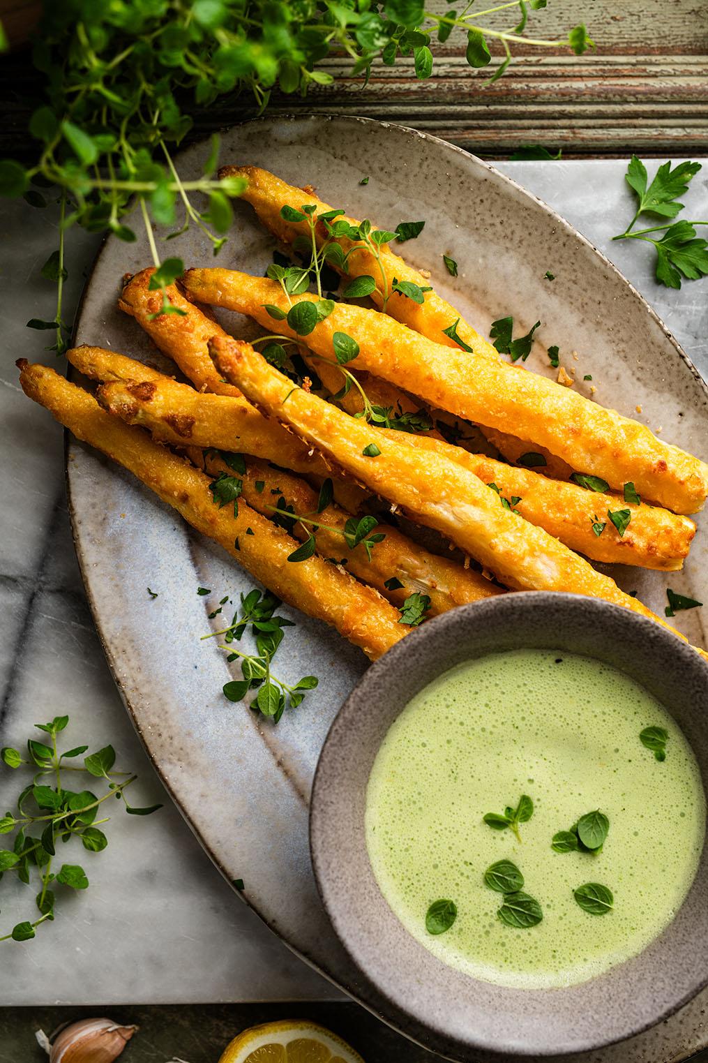 Spargel in Parmesankruste mit Petersilien-Joghurt-Dip