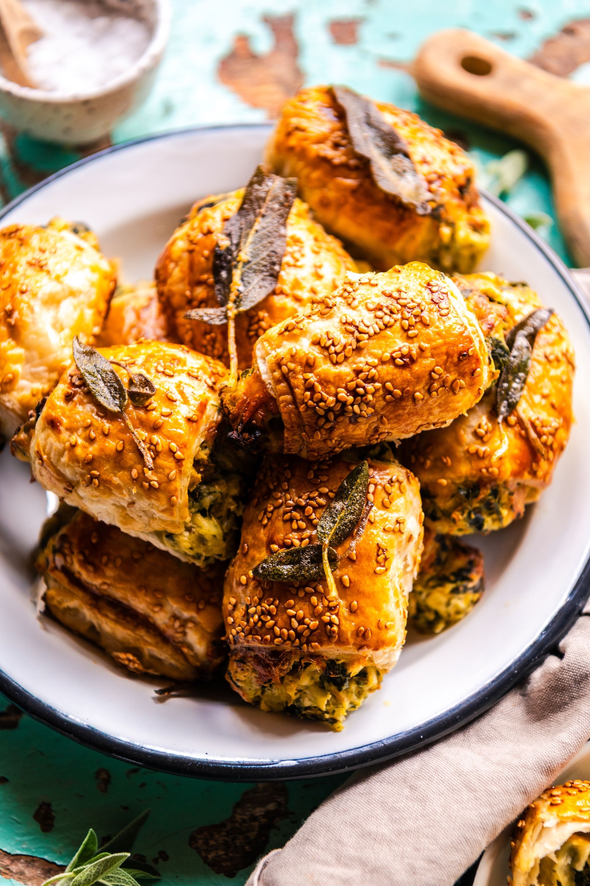 In der Zwischenzeit die Butter in einem kleinen Topf leicht bräunen lassen, bis sie nussig duftet, und die Salbeiblätter darin kurz knusprig schwenken. Die heißen Blätterteigrollen vor dem Servieren mit der aromatischen Salbeibutter beträufeln und mit den Blättern garnieren.